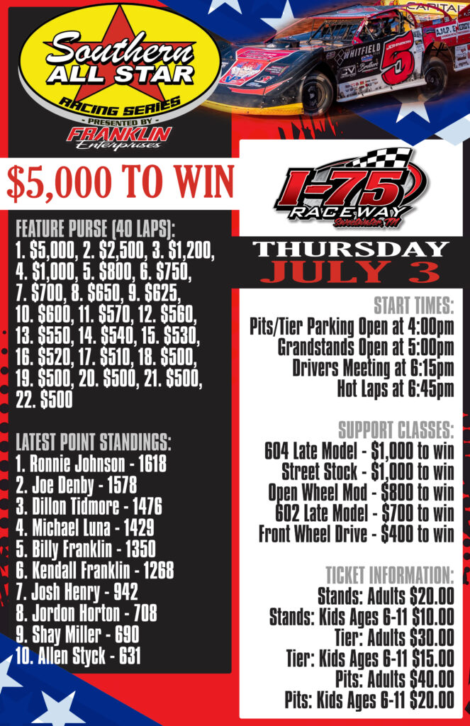 June 30, 2025 — For the first time since the season opener back on February 1, the Southern All Star Dirt Racing Series presented by Franklin Enterprises will be in the Volunteer State over the upcoming Independence Day weekend! A pair of SAS events will be held on Thursday night, July 3 at I-75 Raceway in Sweetwater, Tennessee and on Saturday evening, July 5 at Mountain View Raceway in Spring City, Tennessee. With a $5,000 top prize up for grabs at I-75 and a $4,000 winner’s check on the line at Mountain View plus additional bonuses, one lucky driver could walk away with $13,000 in earnings over the holiday weekend.
